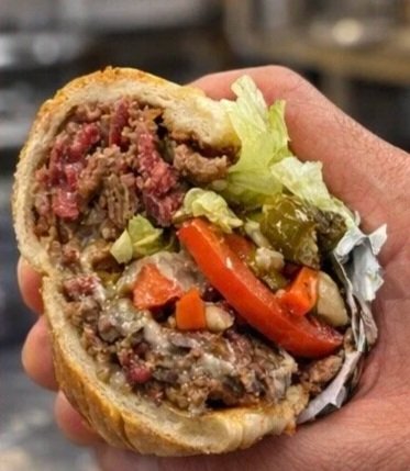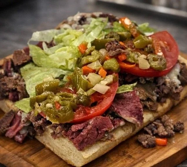 Includes corned beef, roast beef, gyro meat, lettuce, tomato, mayo, onions, mozzarella cheese, and hot giardiniera.